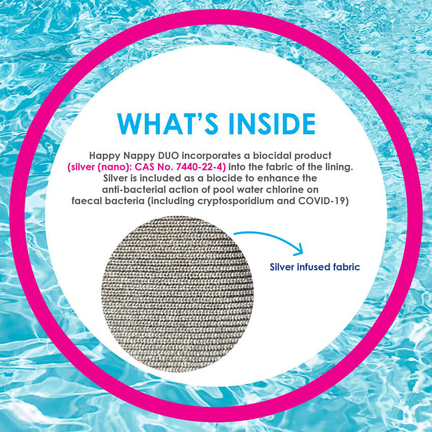 Happy Nappy DUO™ är mer än bara en vanlig badblöja – den kombinerar en badblöja och en innerblöja i ett. Det yttre lagret, format som våra populära Happy Nappy badbyxor, släpper igenom vatten och urin, vilket bibehåller ditt barns balans i vattnet och förhindrar avföringsläckage. Den extra innerblöjan har ett tekniskt silverlager som bevisligen dödar sjukdomsframkallande bakterier som Cryptosporidium, E. coli och till och med Covid-19. Välj Happy Nappy DUO™ för en säkrare simupplevelse för babyn!