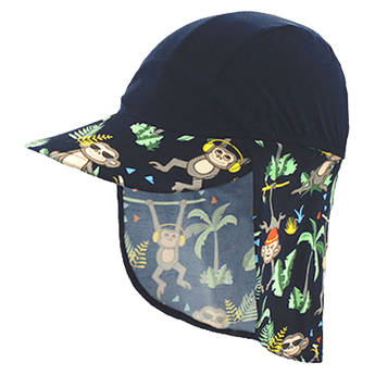 Mörk blå solhatt med motiv av apor och sköldpaddor. UPF50+ solskydd samt extra stor skugga både för ansikte och nacke.