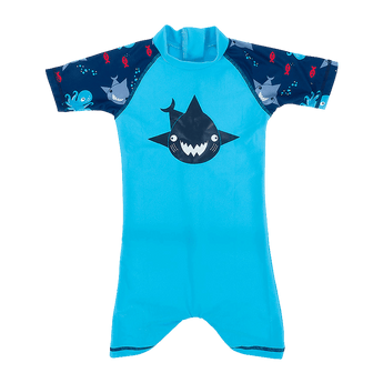 Frisk och färgglad UV-dräkt från Banz, med UPF50+ solskyddsfaktor och tufft hajmotiv. UV-dräkten säkrar barnet mot solbränna, och är en fin och bekväm baddräkt i turkos och mörkblå färg.