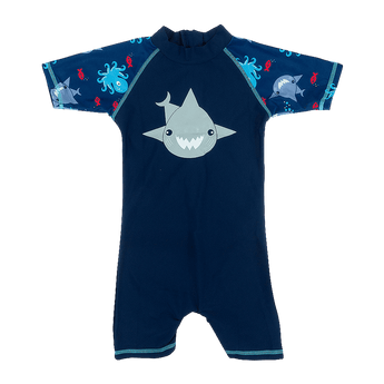 Frisk och färgglad UV-dräkt från Banz, med UPF50+ solskyddsfaktor och tufft hajmotiv. UV-dräkten säkrar barnet mot solbränna, och är en fin och bekväm baddräkt i turkos och mörkblå färg.