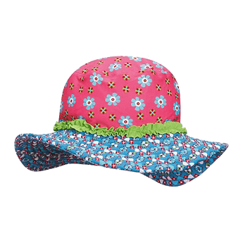 "Flowers" är en vacker solhatt från tyska Playshoes. Solhatten har en blandning av vackra rosa och blå färger, dekorerad med söta blommor. Dessutom har den ett grönt bord som gör hela hatten till en fantastisk huvudbonad för små damer på stranden, vid poolen eller ute på stan!
