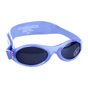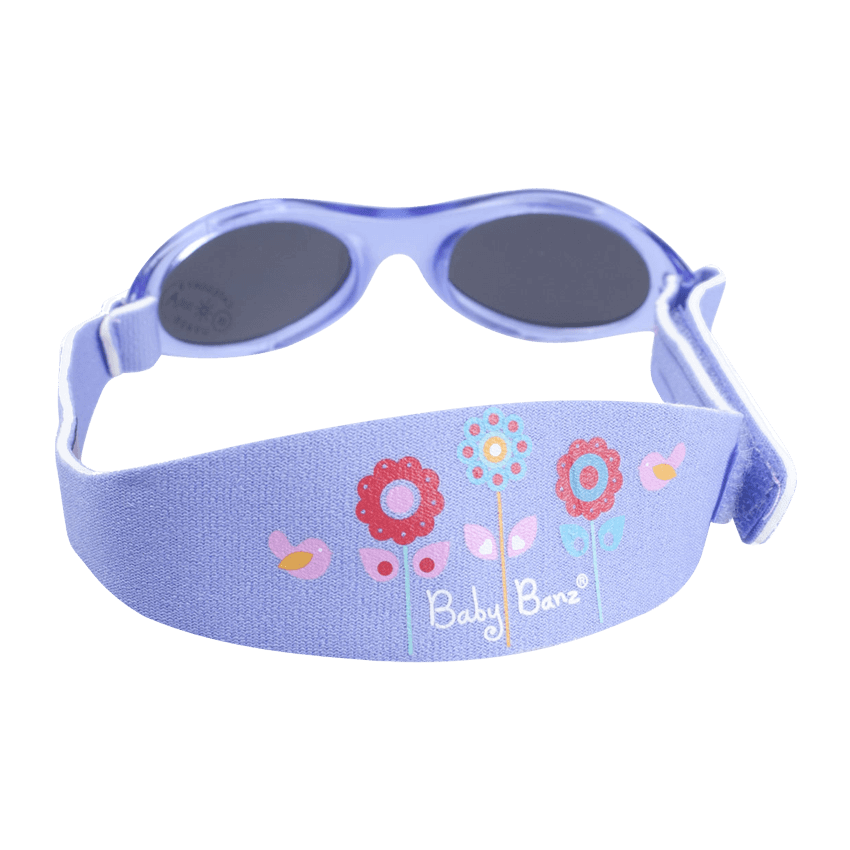 Klassiska solglasögon för barn och baby i Baby Banz / Kidz Banz-stil. Härlig lila färg med små blommor på bandet.