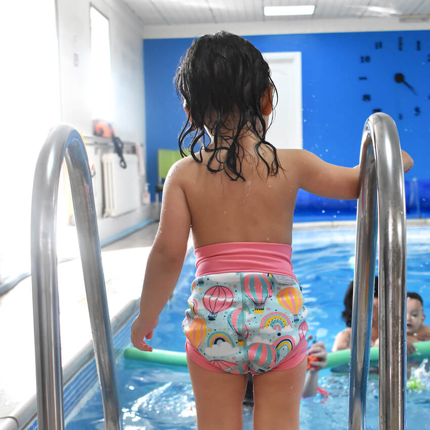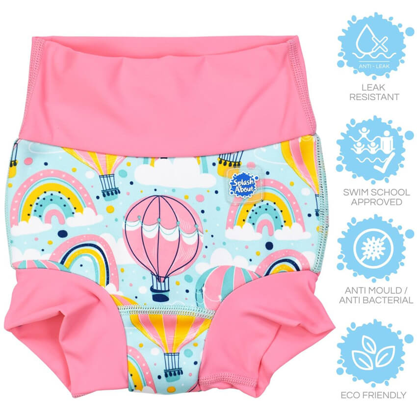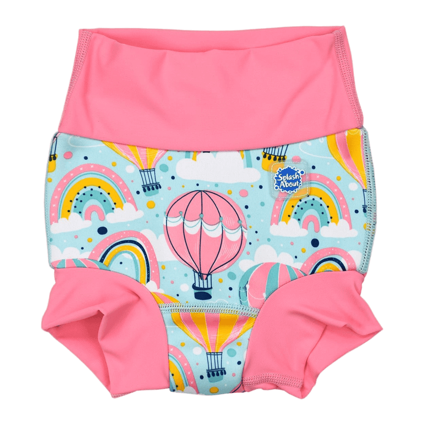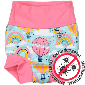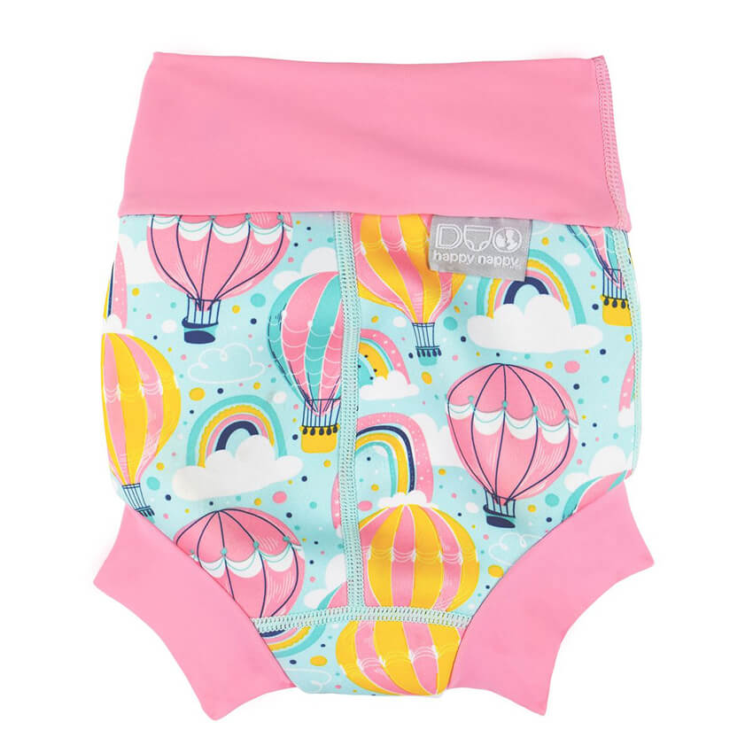 Happy Nappy DUO™ Up and Away är en avancerad badblöja i vackra rosa färger med motiv av luftballonger och regnbågar, speciellt utformad för den lilla simmaren.