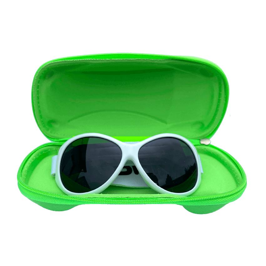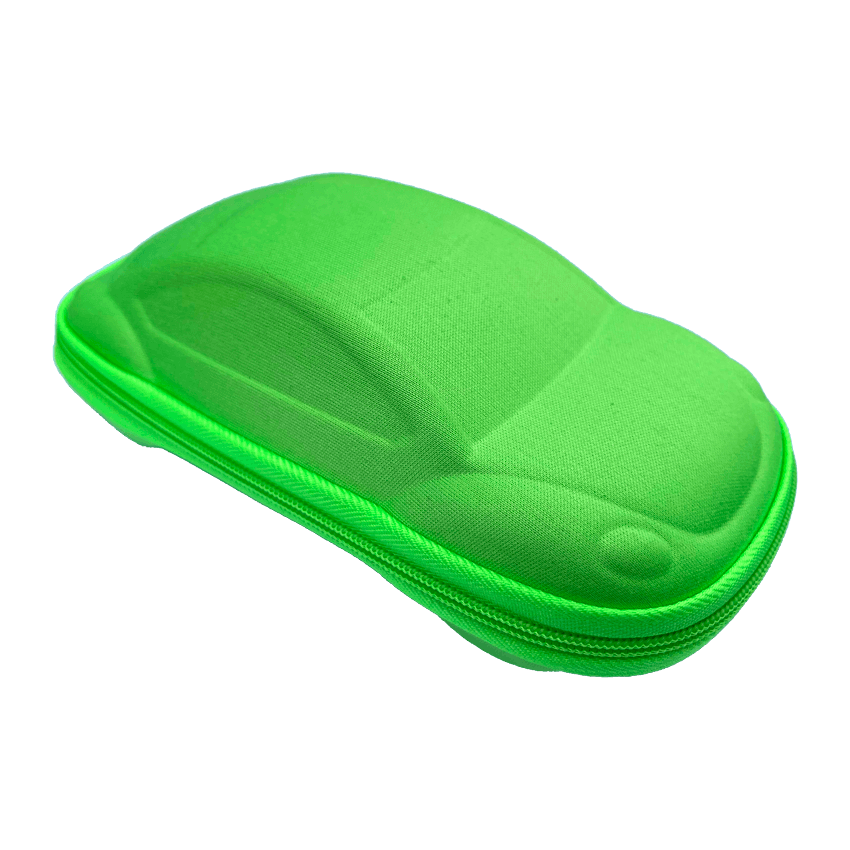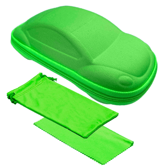 Bra solglasögon kräver stiliga fodral! Lär ditt barn att ta hand om sina solglasögon genom att ge han eller hon ett härligt fodral format som en grön bil, en klut och en skyddande uppbevaringspåse!