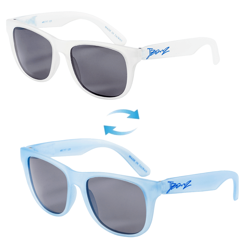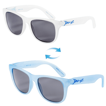 Solglasögonen ger en trygghet i att barnets ögon är väl skyddade, men det viktigaste för barnet är kanske att solglasögonen skiftar färg när de utsätts för solljus! Just detta par skiftar från en vit färg i skuggan eller inomhus till att bli blå när barnet går ut i solen.