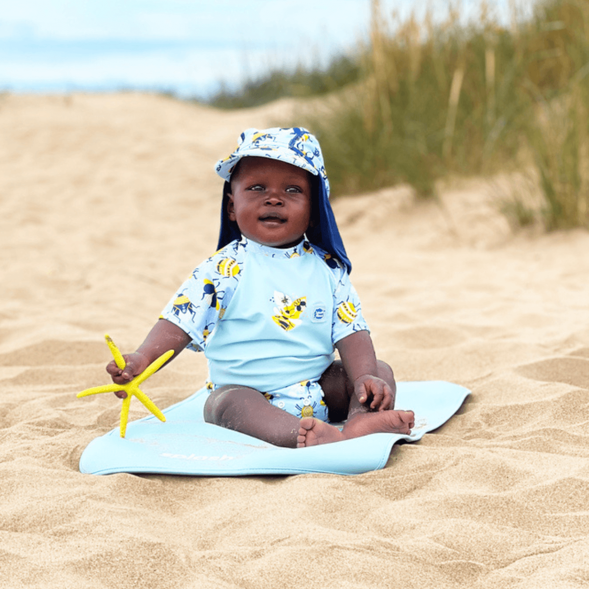 Skötbädden är tillverkad av supermjukt och naturligt antibakteriellt neopren och håller babyn säker i smutsiga skötrum och poolområden. Den är en skötbädd som är mycket enkel att ta med sig, eftersom den rullas ihop när den inte används.