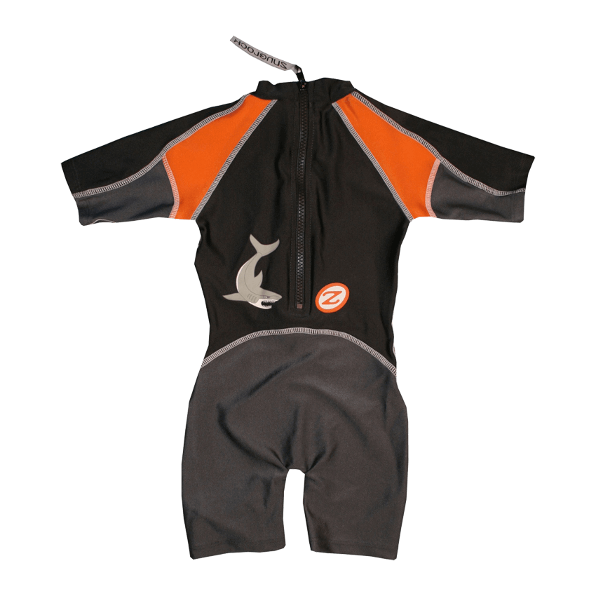 Zunblock Sharkbite UV dräkt i svart och orange hajmönster. En tuff uv dräkt med blixtlås på baksidan.